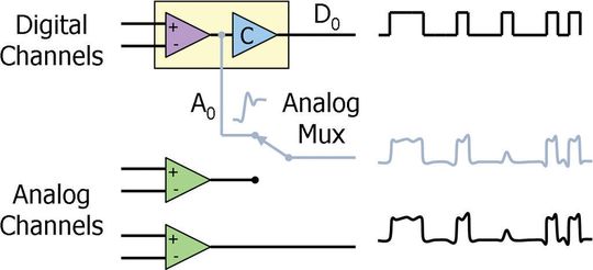 In den Oszilloskopen der Serie MSO70000 von Tektronix wurde eine Analog-MUX-Funktion mit der Bezeichnung iCapture eingeführt: Ein Signal, das an einen der 16 logischen Tastkopfanschlüsse angeschlossen ist, lässt sich gleichzeitig in analoger und digitaler Darstellung anzeigen. Die iCapture-Funktion hat zwei wesentliche Vorteile: