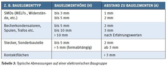 Wenn beschichtungsfreie Zonen gefordert werden, sind hinsichtlich der Bauelemente Abstände zu benachbarten Bauelementen und zum Rand der Baugruppe sowie Transportrand zu definieren (siehe Tabelle 3). Generell sollten Bauteile in Form und Anordnung in Bezug auf Abstände mit Anlagenherstellern und eigenen Spezialisten abgestimmt werden.