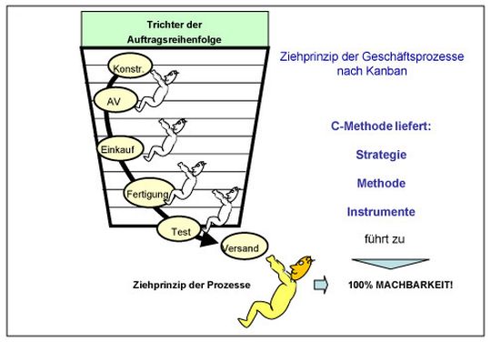 Die von Ilmar Mantz entwickelte C-Methode ist ein umfassendes Konzept und Instrument zur Einführung des Ziehprinzips in allen Geschäftsprozessen der Projekt- und Auftragsabwicklungskette nach Kanban. Das ist eine neue Art des Gestaltens der Geschäftsprozesse, da Kanban bisher nur in der Bereitstelllogistik bekannt ist. Sie ist umfassend und vereinigt Strategie und Methodik sowie Systemtechnik und Instrumente.