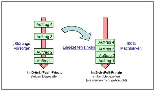 Dieses Prinzip in die Geschäftsprozesse der Auftragsabwicklung zu übertragen ist neu – und es funktioniert. Das mit der C-Methode realisierte Ziehprinzip (Pullprinzip) erschließt die im Drückprinzip (Pushprinzip) bestehenden, systemimmanenten Potenziale von Effizienz und Effektivität. Im Drückprinzip werden vorhandene Potenziale durch ständige Störungen, Unterbrechungen, ungeeignete Planungsroutinen, Eilaufträge etc. geradezu vernichtet (siehe Grafik).