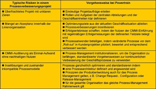 Nach einer Studie des SEI (Performance Results of CMMI-Based Process Improvements, August 2006) erreichten die 30 befragten Unternehmen nach der CMMI-Einführung signifikante Verbesserungen z.B. bei Kosten (durchschnittlich 34%), Produktivität (61%) und Qualität (48%). CMMI eignete sich daher besonders gut für Powertrain, da messbare Leistungssteigerungen der Entwicklungsprozesse erzielt werden sollten. Als System-Lieferant war für Powertrain außerdem ausschlaggebend, dass System-, Software- und Komponentenentwicklungsprozesse mit den Prozesskategorien des CMMI-Modells verglichen werden können.