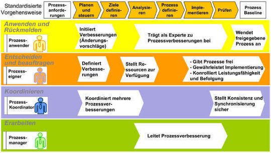 Um eine nachhaltige Wirkung der Prozessverbesserungen sicherzustellen, wurden bereits zum Projektstart die jeweiligen Prozesseigner und Prozessmanager etabliert, wobei sich die Struktur der Verantwortungen an den CMMI Prozesskategorien orientiert. Prozesseigner und Prozessmanager bleiben über das Projekt hinaus in der Verantwortung für die jeweilige Prozesskategorie wie z.B. für Requirements Management oder Verification/Validation bzw. für den jeweiligen Geschäftsprozess wie z.B. Software-Entwicklung.