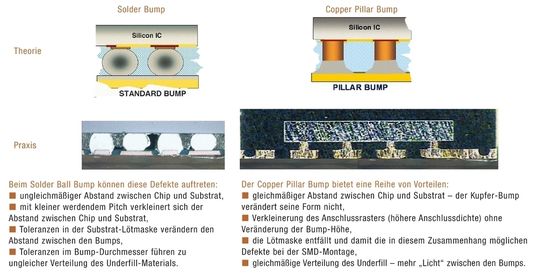 Zum Vergleich: Der konventionelle Solder Ball Bump fungiert gleichermaßen als mechanische und elektrische Verbindung. Gegenüber der Lotkugel bietet der Copper Pillar noch einen Vorteil: Der Pillar Bump ist trotz gleicher Höhe schmaler als der kugelförmige Solder Ball Bump. Damit ermöglicht die Copper-Pillar-Bump-Geometrie nicht nur ein feineres Anschlussraster, die schlanken Anschlüsse verbessern die elektrischen Eigenschaften des Anschlusses, während sich aufgrund des hohen Kupferanteils das thermische Verhalten verbessert (höhere Leitfähigkeit). Der Pillar Bump kann zudem unterschiedlich geformt werden, um die bei bestimmten Halbleitern auftretenden Probleme der steigenden Spannung und Wärmeentwicklung zu lösen.