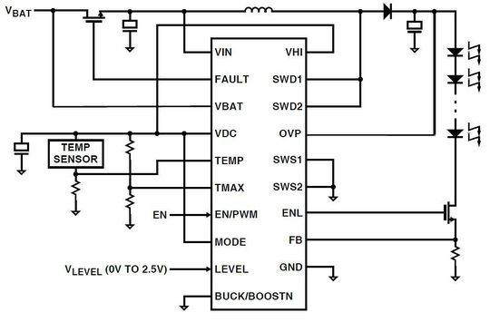 Dies lässt sich verhindern, indem die Ausgangsspannung nicht auf Masse, sondern auf die Eingangsspannung bezogen wird. Dazu wird der Shunt-Widerstand zur Strommessung an die Eingangsspannung angeschlossen. Dieser sorgt dafür, dass die Ausgangsspannung immer größer ist als die Eingangsspannung, somit arbeitet der Treiber konstant im Boost-Modus. Der Baustein verfügt zudem über einen Eingang für einen Temperatursensor. Misst dieser Temperaturen, die über einem zuvor eingestellten Wert liegen, reduziert der Treiber den Ausgangsstrom der LEDs und verlängert so ihre Lebensdauer deutlich.