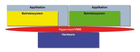 In einem hypervisor-basierten System (Bild 1) wird der Hypervisor auch als VMM (Virtual Machine Manager) bezeichnet. Vorteil dieses Aufbaus ist, dass keine Änderungen am auszuführenden Betriebssystem erforderlich sind, und dies mit geringem Overhead einhergeht. Andererseits benötigt dieses Vorgehen Unterstützung durch die vorliegende Hardware.