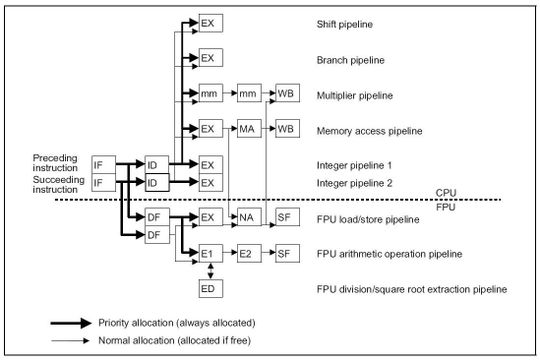 Ebenfalls zu beachten ist, dass die FPU des SH2A-Cores im Unterschied zu anderen Systemarchitekturen keine externe Einheit ist. Bei anderen Core-Architekturen ist die FPU als externe Einheit konfiguriert, an die Tasks übergeben werden und bei der die CPU auch diese Befehlsübergabe kontrollieren muss. Die FPU des SH2A ist Teil der Pipeline des Cores und arbeitet auch dementsprechend. Daher gibt es bei FPU-Operationen keinen Overhead für „Task Handling“. Dies lässt sich im Blockschaltbild der SH7216-Pipeline erkennen (Bild 1).