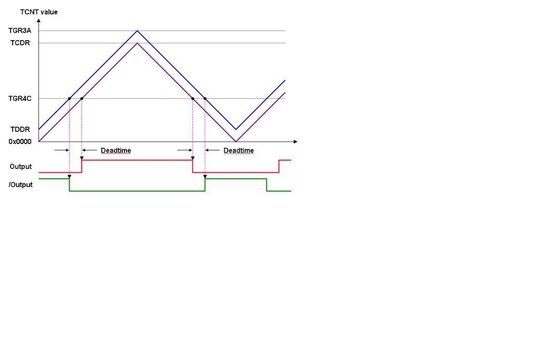 Mit Hilfe des „komplementären PWM-Modus“ lassen sich zwei Kanäle so kombinieren, dass 3-Phasen-PWM-Signale zur Steuerung des Umrichters einschließlich der Totzeit-Einfügung erzeugt werden können. Bild 3 zeigt, wie diese PWM-Ausgangssignale so erzeugt werden können, dass die Totzeit bereits eingefügt ist. Abgebildet ist ein Paar der komplementären Pulsbreiten-Modulationen, obwohl unter Verwendung dieser zwei Kanäle des MTU2 drei Paare möglich sind. Der Timer verfügt außerdem über eine „Phasenzähler-Betriebsart“, die sich zur Auswertung des quadratur-kodierten Ausgangssignals des Motors eignet.