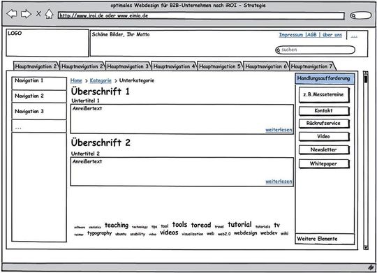 Dieses Layout haben wir „3-Spalten-Design“ getauft und es immer wieder getestet - insbesondere in der B2B-Welt. Das Ergebnis: Die Menschen kennen das Design, wissen, wie sie es bedienen können und finden sich leicht und damit schnell zurecht. Sicherlich ist dieses Design nur eine Grundvorlage. Die Details müssen für Ihren Internetauftritt individuell abgesprochen werden. Trotzdem haben Sie eine Marschrichtung, mit der Sie optimal vorgehen können.