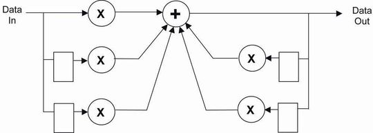 Das rekursive Filter (IIR) ist dem FIR-Filter ähnlich, außer dass Feedback-Pfade hinzukommen. Design und Analyse von IIR-Filtern werden damit komplexer als bei FIR-Filtern. Andererseits kann der IIR-Ansatz auf gleicher Chipfläche zu einem leistungsfähigeren Filter führen. Zwar gibt es verschiedene IIR-Architekturen, doch ein gemeinsamer Ansatz besteht darin, IIR-Filter aus Bi-Quads zweiter Ordnung aufzubauen (Bild 3).