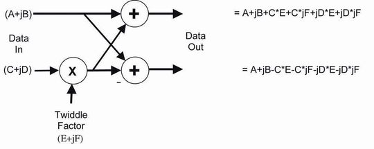 Für viele Applikationen – von der Bildkomprimierung bis zur Bestimmung des Spektralgehalts einer Datenabtastung – werden schnelle FFTs verwendet. Dafür gibt es mehrere Methoden: Üblich ist die Cooley-Tukey-Dezimation, bei der die FFT in mehrere kleinere FFTs aufgeteilt wird. In der einfachsten Implementierung wird ein als Radix-2-Schmetterling bezeichnetes Element benutzt, das von den Input-Daten mehrere Mal durchlaufen werden muss (Bild 2). Laut der linken Seite des Diagramms ist die Berechnung einfach. Da alle Multiplikationen und Additionen jedoch mit komplexen Zahlen erfolgen, stellt die tatsächlich erforderliche Anzahl von Multiplikationen und Additionen doch eine größere Herausforderung dar, wie die rechte Seite des Diagramms zeigt.