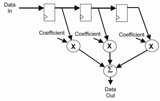 Das nichtrekursive Filter (Bild 1) speichert eine Serie von n Datenelementen, von denen jedes mit einem zusätzlichen Zyklus verzögert wird. Jedes Datenelement wird mit einem Koeffizienten multipliziert. Die aufsummierten Resultate ergeben den Output. Einige Implementierungen führen alle Multiplikationen parallel aus. Allgemeiner ausgedrückt, wird die Implementierung in N Stufen aufgeteilt, wobei ein Akkumulator die Teilergebnisse von einer Stufe zur nächsten weitergibt. Diese handelt Geschwindigkeit gegen funktionale Ressourcen ein: Es gibt N Berechnungsstufen, die aber nur n/N Multiplika-toren benötigen. Abhängig vom Aufbau der Koeffizientenwerte und davon, ob die Koeffizienten statisch oder dynamisch sind, sind allgemein etliche weitere Designoptimierungen üblich.