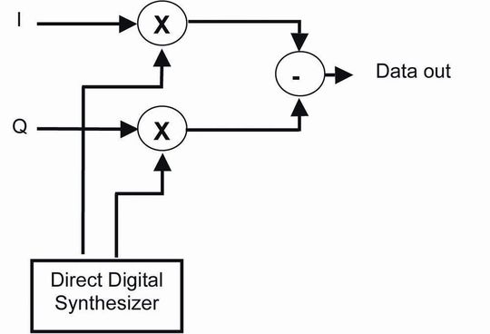 Viele Applikationen setzen Mixer für die Verschiebung der Frequenz eines Signals ein. Vom Konzept her könnte man zwar mit einem einzigen Multiplizierer auskommen, doch es hat mehrere Vorteile, die Zahlen in komplexer Form darzustellen. Meist erfolgt dies durch Repräsentation der Signale als I- und Q-Komponenten. Bild 4 zeigt einen Mixer, wie man ihn für die digitale Aufwärtswandlung verwenden würde.