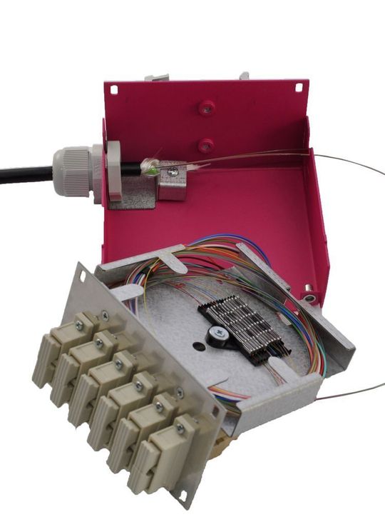 Mit 115 × 61 × 113 mm baut diese Spleißbox wesentlich kompakter als vergleichbare 19˝-Lösungen. Im Hinblick auf eine zeitsparende und einfache Installation ist FIMP zudem spleißfertig bestückt und integriert Spleißkamm, Spleißablage, Kupplungen, Pigtails sowie die Kabelverschraubung. Als Kupplungsvarianten stehen SMA, ST, SC, LC, FC-PC und E-2000 zur Verfügung. Zum Spleißen lässt sich sowohl die Frontplatte als auch die Spleißkassette vollständig herausnehmen, wobei die Spleißkassette an einem Spleißgerät fixiert werden kann. Da das pulverbeschichtete Edelstahlgehäuse magnetisierbar ist, lässt sich die Spleißbox an einen Schaltschrank oder ein Gehäuse befestigen, falls keine Ablagemöglichkeit besteht.