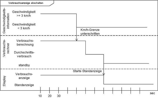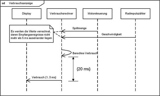 - Angabe der Zeit: Im Sequenzdiagramm werden Zeiten in Intervallen angegeben. Diese Inter-valle werden in folgender Form dargestellt: {tmin .. tmax}. Im Falle eines Zeitpunktes sagt das Intervall aus, dass ein Ereignis zwischen dem Zeitpunkt tmin und dem Zeitpunkt tmax stattfinden muss. Im Falle einer Zeitspanne bedeutet es, dass das Ereignis mindestens tmin Zeiteinheiten und maximal Zeitpunkt tmax Zeiteinheiten dauern darf. Die im Diagramm verwendete Zeiteinheit (Sekunden, Millisekunden, Nanosekunden) wird üblicherweise in einem Notizfeld in der rechten oberen Ecke des Diagramms angegeben.