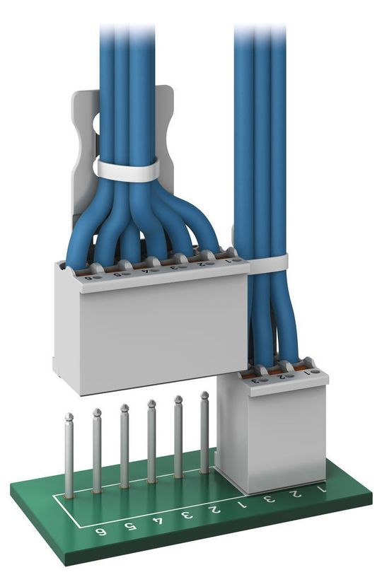 Eine weitere Vereinfachung erzielt man, indem nur die Kontaktstifte in die Federleiste gesteckt werden. So ergibt sich daraus eine Leiterplattenklemme (Lieferzustand), die wie gewohnt mit den gängigen Verfahren in eine Platine gelötet wird. Soll die Platine im Servicefall ausgetauscht werden, kann die Buchsenklemme wie ein Steckverbinder gezogen und ohne Umverdrahtung wieder gesteckt werden (Bild 2 a + b).