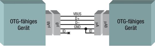 Wie erkennt ein Produkt mit Micro-AB-Buchse, was eingesteckt wurde? Die OTG-Spezifikation sieht zusätzlich zu den vier Kontakten bei Standard-USB-Kabeln einen fünften Kontakt mit der Bezeichnung ID vor. Nachdem der ID-Pin bei Standard-USB-Verbindungen nicht vorhanden ist, wurde in der Spezifikation festgelegt, dass bei einem nicht beschalteten ID-Pin die entsprechende Seite als Peripheriegerät betrachtet wird. Liegt der ID-Pin hingegen an Masse, übernimmt das jeweilige Gerät die Rolle des Hosts (siehe Bild 1).