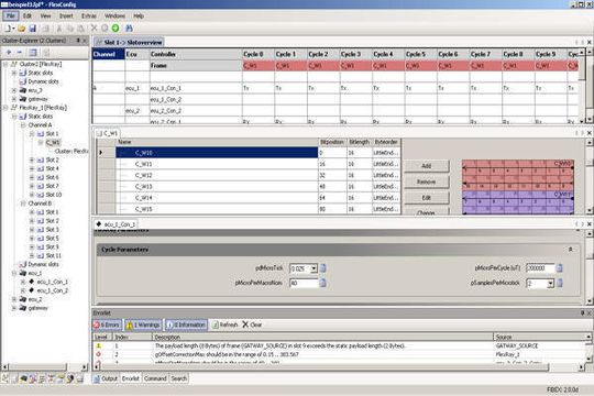 Ein anderer Ansatz wird bei der Design- und Konfigurationssoftware FlexConfig von Eberspächer Electronics gewählt. FlexConfig (Bild 6) ist eine kostengünstige, leistungsfähige und bedienungsfreundliche Software für automobile Netzwerke. Mit Hilfe von Assistenten können neue Netzwerke leicht und schnell erstellt werden. Bestehende Netzwerke werden übersichtlich dargestellt und können leicht geändert werden. Durch zahlreiche Exportmöglichkeiten kann nahezu jede Hardwareplattform mit Netzwerkdaten konfiguriert werden. Bei FlexConfig wird zuerst die AUTOSAR Datei in eine FIBEX 3.0 Datei umgewandelt. Dies geschieht über einen externen Konverter. Danach kann man die FIBEX Datei in FlexConfig importieren. Durch diese Vorgehensweise muss nicht das FlexConfig an AUTOSAR angepasst werden, sondern ein externer Konverter erlaubt die Weiternutzung des bestehenden Werkzeugs. Dieser Ansatz wird zurzeit umgesetzt.