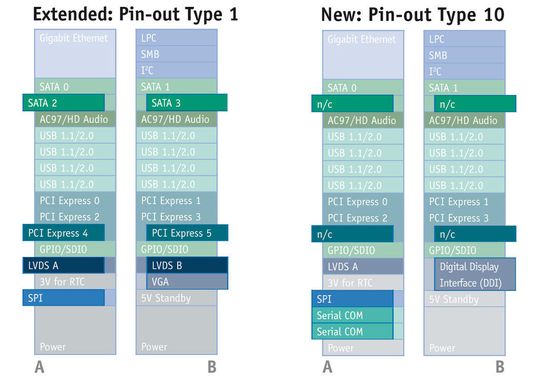 Was sich nach den neuen Spezifikationen für alle Pinouts ändert: Neben dem bisherigen Firmware-Hub gibt es ein neues BIOS bzw. Firmware Interface für interne und externe Boots der neuen Prozessorgeneration. Es handelt sich um ein Serial Peripheral Interface (SPI), dem zukünftigen Interface für Firmware-Flashs auf Modul- und Carrier-Boards. Für diesen Zweck werden bisher reservierten Pins genutzt.