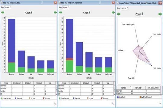 Als letzter Schritt wird nach der physikalischen Zuordnung der logischen Designs die Wiring Synthesis durchgeführt. In diesem Schritt werden die logischen Signale aus dem AUTOSAR Modell in elektrische Leitungen überführt, Kabelsatz, Stecker und Kontakte aus der Fahrzeugtopologie generiert und die optimale Spleißung durchgeführt. Daraus werden kabelbaumrelevante Informationen wie Leitungslängen, Bündeldurchmesser, Gewichtsinformationen sowie erste Material- und Fertigungskosten ermittelt und dem Entwickler wie in Bild 6 gezeigt in entsprechenden Diagrammen zur Verfügung gestellt.