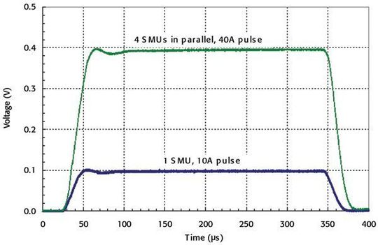 Neue SMU-Architekturen erhöhen die Leistung bei der Impuls-Sweep-Methode durch mehrere parallel geschaltete SMU-Kanäle. Beispielsweise kann bei einigen zweikanaligen SMUs die Anzahl der SMU-Kanäle von zwei auf vier erhöht werden. Die Kombination von Impuls-Sweep und einem mehrkanaligen Betrieb erlaubt die Einspeisung von weit höheren Strömen als bei nur einer einzigen SMU mit DC-Sweep.