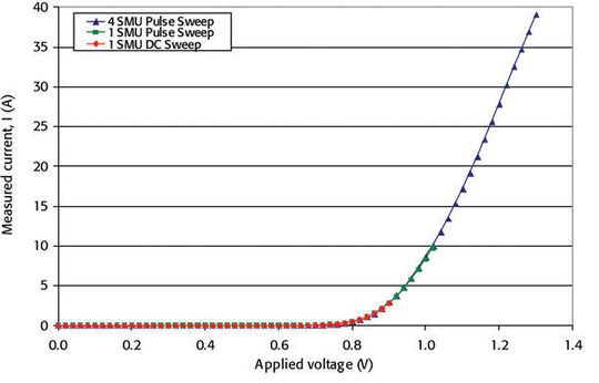 Nach diesem verifizierten Impulsverhalten programmierten die Ingenieure einen Impuls-Sweep, bei dem vier SMUs kombiniert wurden und zeichneten eine I-U-Kurve über einer P-N-Diode als Testobjekt auf (Bild 3). Interessant ist dabei die Korrelation zwischen der SMU, die einen DC-Sweep bis 3 A ausführt, und der anderen SMU, die einen Impuls-Sweep bis 10 A ausführt. Dann erweiterten die Ingenieure die erreichbare I-U-Kurve auf bis zu 40 A.