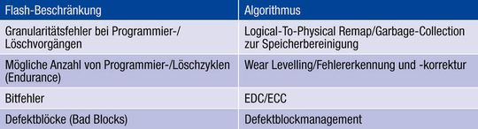 Für eine garantierte Konsistenz von gespeicherten Daten und Code muss jedes System, das einen NAND-Flash-Speicherbaustein enthält, über ein geeignetes Flash-Datenmanagement verfügen, um den oben erwähnten technischen Beschränkungen erfolgreich Paroli bieten zu können. Dies erfolgt mit Hilfe leistungsfähiger Algorithmen, die sowohl als Softwareroutinen oder als eigenständige HW-Blöcke implementiert sein können (siehe Tabelle 3).