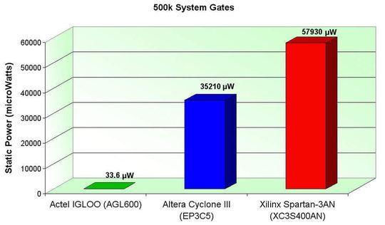So bietet Actels Low-Power Flash-FPGA-Technik gegenüber SRAM-FPGAs kleinere Abmessungen und einen geringeren Stromverbrauch. Die nicht flüchtigen, wiederprogrammierbare Flash-FPGAs nutzen als programmierbare Schalter für die Verbindungsleitungen lediglich eine einzige Flash-Zelle. Im Vergleich dazu nutzen SRAM-FPGAs aus sechs Transistoren bestehende Zellen. Sie sind deshalb größer und verbrauchen mehr Strom. Actels nano-FPGAs werden in Gehäusen mit Abmessungen von 3 mm × 3 mm angeboten. Die Flash-Bausteine verbrauchen nur 2 µW.