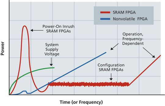 Während des Einschaltens können Stromspitzen von mehreren Ampere entstehen, die mehrere Mikrosekunden dauern. Um die Stromspitzen beim Einschalten von SRAMs abzumildern, setzen Entwickler oft komplexe Power-Sequencing-Techniken ein. Diese verursachen jedoch Zusatzkosten und erhöhen die Komplexität des Systems. Beim Einschalten von Actels Flash-FPGAs entstehen gegenüber SRAM-FPGAs nur geringe Stromspitzen.