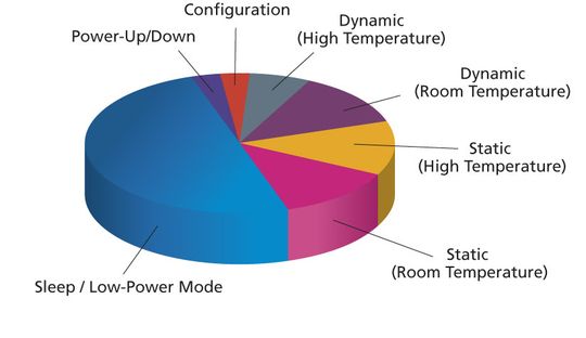 Ein FPGA kann sich über längere Zeiträume im Standby-Mode befinden. In diesem Zustand ist das FPGA zwar eingeschaltet, jedoch nicht aktiv. Die Leistungsaufnahme im Standby wird normalerweise als „statische Leistung“ bezeichnet. Sogar im Standby verbrauchen SRAM-FPGAs wesentlich mehr Strom als Flash-FPGAs. Auch die Temperatur spielt im Standby-Modus eine wichtige Rolle. Bei Raumtemperatur können SRAM-FPGAs über 1000-mal mehr statische Leistung aufnehmen als Flash-FPGAs, wobei sich der Leistungsverbrauch bei steigender Temperatur erhöht. Für tragbare Geräte, die sich meist im Standby befinden, sind Flash-FPGAs die beste Wahl (Bild 3).