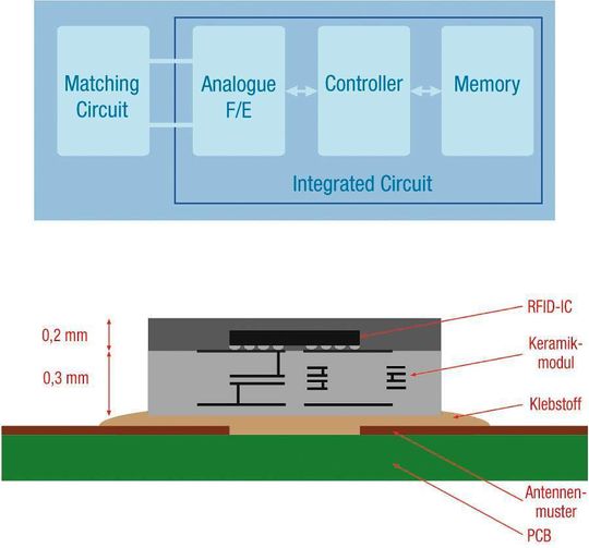 Das Modul besteht aus dem LTCC-Substrat von Murata, dem eigentlichen IC und dem Gehäuse. Alle erforderlichen HF-Schaltungen sind in das LTCC-Substrat des Moduls eingebettet, auf das schließlich das IC montiert wird (Bild 2). In das LTCC-Substrat integriert sind im Einzelnen das breitbandige Antennenfilter, die Impedanzanpassungsschaltung für die Antenne und ein bis 10 kV reichender ESD-Schutz. Die Dicke des Substrats beträgt lediglich 550 µm.