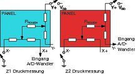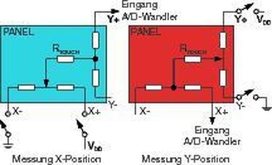 Wird die obere Platte, die auch aus transparentem Kunststoff bestehen kann, mit einem Finger oder Stift an der Berührungsstelle so durchgebogen, dass ein Kontakt entsteht, kann durch eine wechselseitig anliegende Spannung an der jeweils gegenüberliegenden Fläche eine Spannung gemessen werden, die im Verhältnis zur X- und Y- Position steht. Je nach verwendetem Material ist es erforderlich, dass punktförmige Miniaturabstandshalter den nötigen Abstand im unbelasteten Zustand gewährleisten.
