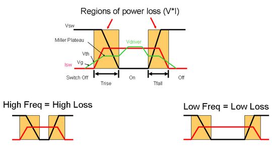 Hierin steht IdsOn für den Strom im FET, VdsOff ist die Spannung am FET im Off-Zustand (Vin), bei tRise und tFall handelt es sich um die Anstiegs- und Abfallzeit des FET und Tsw ist die Schaltperiode (Kehrwert der Schaltfrequenz).