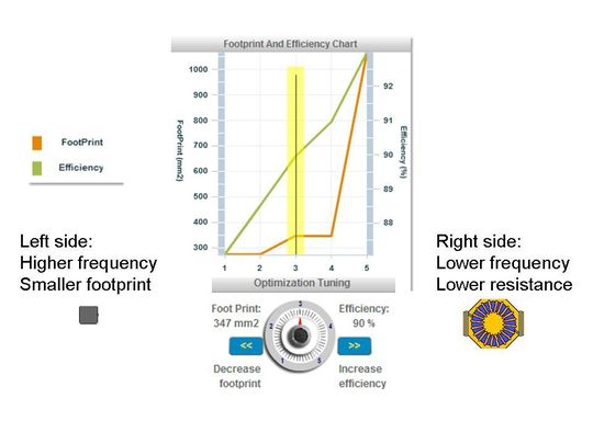 In WEBENCH wird die Optimierung in Richtung kleiner Footprint, hoher Wirkungsgrad und niedrige Materialkosten durch einen virtuellen Drehknopf und mithilfe von Grafiken vereinfacht. Der Anwender kann den Knopf nach rechts drehen, um einen hohen Wirkungsgrad zu erzielen, oder für einen kleinen Footprint nach links. In Bild 6 ist ein Diagramm mit Optimierungen für einen Buck-Schaltregler zu sehen. Generell ist bei einer hohen Optimierungszahl (rechte Seite des Diagramms) die Schaltfrequenz niedriger, was geringere Schaltverluste und einen höheren Wirkungsgrad zur Folge hat. Dies erfordert allerdings auch eine höhere Induktivität zur Begrenzung des Welligkeitsstroms, sodass eine größere Spule mit mehr Windungen benötigt wird und der Footprint des Designs größer wird. Das Gegenteil trifft bei niedrigen Optimierungszahlen (linke Seite) zu. Dank höherer Schaltfrequenzen kann die Induktivität niedriger gewählt werden. Die dementsprechend kompaktere Spule verkleinert den Footprint, jedoch haben die vermehrten AC-Schaltverluste auch eine Verringerung des Wirkungsgrads zur Folge. Der Zielkonflikt zwischen hohem Wirkungsgrad und kleinem Footprint wird hieran sehr gut deutlich.