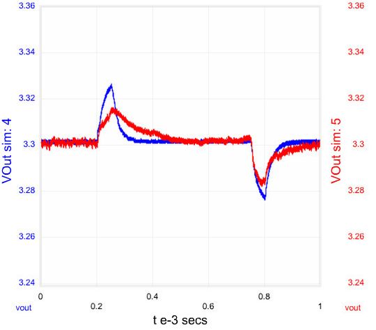 Als Beispiel soll betrachtet werden, wie zwei verschiedene Schaltregler reagieren, wenn der Laststrom von 2 A plötzlich auf 0,2 A abfällt und wieder auf 2 A ansteigt; mit einer Abfall- und Anstiegszeit von jeweils 50 µs. Bild 7 zeigt Simulationen zum Vergleich des im Voltage-Mode-PWM-Modus arbeitenden LM22680 mit dem LM25576, der auf dem Emulated-Current-Mode-Regelverfahren (ECM) basiert. Wie man sieht, erholt sich der ECM-Regler schneller von den Lastsprüngen, während beim PWM-Baustein das Über- und Unterschwingen geringer ist. Welcher Lösung der Vorzug gegeben wird, hängt also davon ab, welches Verhalten für den Designer wichtiger ist.
