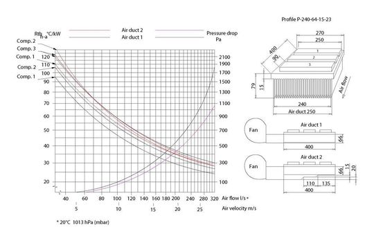 Diagramm 1 zeigt die Performance-Kurven des Webra-Kühlkörpers W-240-64-15-23 für drei Komponenten des PrimePACK3-Formats. Je nach Lüfter (denkbar sind leistungsstarke Lüfter bis 1 kW) können so 1 bis 2 kW Verlustleistung je Komponente abgeführt werden.