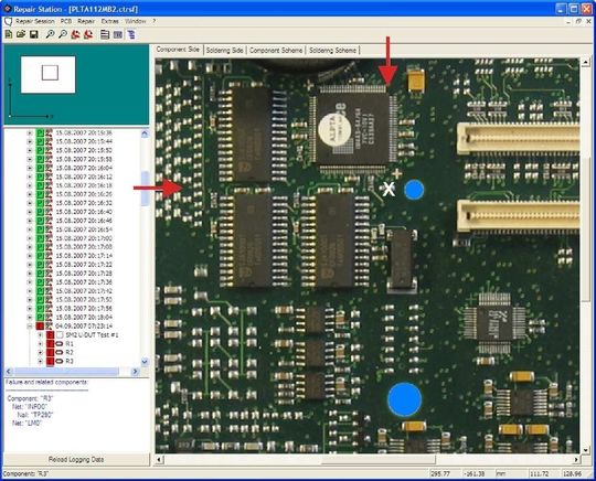 Zu jedem Testgerät gehört auch eine Reparaturstation, zu der die während der Tests gesammelten Daten übertragen werden. Die Testobjekte sind auf dem Display des Reparaturrechners realistisch dargestellt. Das defekte Bauelement wird angezeigt, die als fehlerhaft erkannten Komponenten ausgelötet, ein neues Bauteil per Hand eingelötet, und unverzüglich wieder in den Testkreislauf eingeschleust.