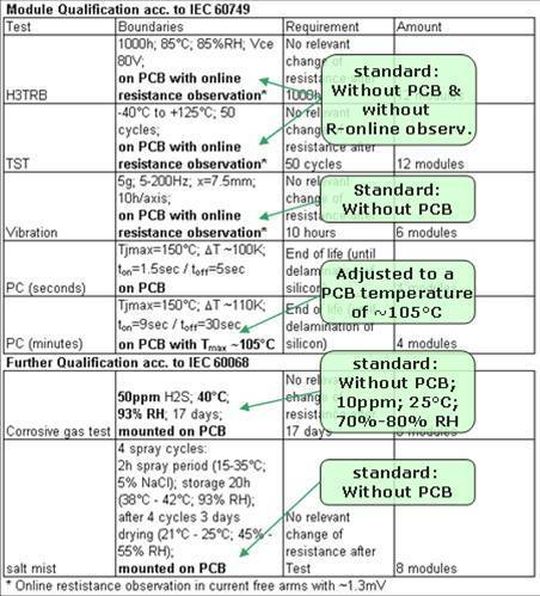 Die grünen Felder in den Bildern beschreiben die in den ursprünglichen Normen definierten Bedingungen. Alle modulbezogenen Tests sind ohne messbare Kontaktveränderungen bestanden. Der Vibrationstest lief unter den gleichen Bedingungen wie beim Standard-Test ab, jedoch mit einer Beschleunigung von 20 g. Beim Vibrationstest ist es immer schwierig, einen repräsentativen Versuchsaufbau zu finden, weil der geometrische Aufbau und die Massen in realen Anwendungen nie gleich sind. Deshalb wurde entschieden, den Test mit einer kleinen Leiterkarte ohne zusätzliche Massen und ohne eine Befestigung am Modul zu realisieren. Diese Vorgehensweise kam auch für die Standard-Schwingungsprüfung zur Anwendung. Das Ergebnis zeigt, dass auch eine starke Schwingung mit 20 g den PressFIT-Kontakt nicht beschädigen oder beeinträchtigen konnte.