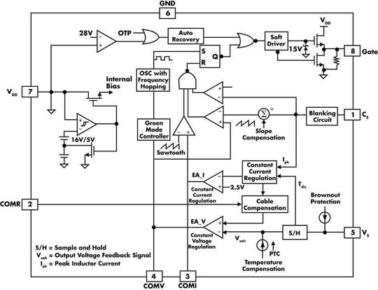 Bild 3 zeigt das interne Blockdiagramm des FAN102. Er verfügt über eine interne Referenzspannung mit einer Toleranz von ±1% für den Fehlerverstärker, der die Schwankungen von Ausgangsstrom/-spannung abhängig von der Toleranz der externen Bauteile minimiert. Zudem ist eine integrierte Kompensationsschaltung für Temperaturabweichungen der externen Komponenten enthalten, die eine hohe Genauigkeit auch bei Temperaturschwankungen gewährleistet. Der interne Oszillator arbeitet mit einem Frequenzsprungverfahren, um die EMI-Abstrahlung zu reduzieren, wodurch kleinere Netzfilter in der Eingangsseite möglich sind.