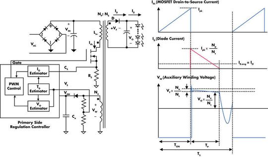 Bild 2 zeigt die grundlegende Schaltung einer primärseitigen Regelung mit einem Flyback-Konverter und den typischen Signalverlauf. Im Allgemeinen wird bei einer Regelung auf der Primärseite aufgrund der besseren Ausgangsregelung ein Betrieb im DCM-Modus (Discontinuous Conduction Mode) bevorzugt. Entscheidend für eine derartige primärseitige Regelung ist die Gewinnung von Informationen über die Ausgangspannung und den Ausgangsstrom, ohne diese aber direkt zu messen. Wenn diese Werte verfügbar sind, kann die Steuerung einfach über einen konventionellen PI-Regler erfolgen.