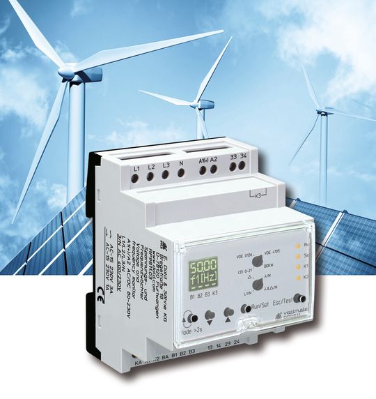 Mit dem aktuellen Spannungs- und Frequenzwächter RP 9811 der Familie VARIMETER NA bietet Dold eine sichere und normkonforme Lösung zur optimalen Netzüberwachung bei der Energieeinspeisung. Bedienerfreundlich sind die voreingestellten Normen mit einem Drehschalter entsprechend den länderspezifischen Anforderungen wählbar. Bei unzulässigen Spannungs- und Frequenzwerten trennt der RP 9811 die Eigenerzeugungsanlage sicher vom Netz.