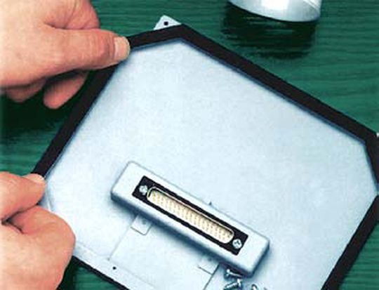 Abhilfe schaffen hier leitfähige Schaumdichtungen. Leitfähiger Schaum ist ein mit einem vernickelten Metallgeflecht versehener Polyurethanschaum, der in einem selbstklebenden Gebinde aus Kupferfolie und PET-Trägerfilm (Polyethylen-Terephthalat) zusammengefasst ist. Dieser leitfähige Schaum sorgt für eine ausreichende Dichtigkeit, selbst wenn sich die Abdeckung verbiegt.