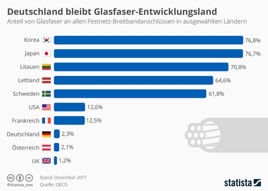 Man kann es nicht schön reden. Was den Glasfaserausbau betrifft, nimmt Deutschland den Rang eines Entwicklungslandes ein. 2017 waren nur 2,3 Prozent aller stationären Breitbandanschlüsse in Deutschland mit einem Glasfaserkabel verbunden, erklärt die OECD. In kaum einem anderen Industrieland ist der Anteil derartig niedrig, weltweit nimmt Deutschland den fünftletzten Platz ein.