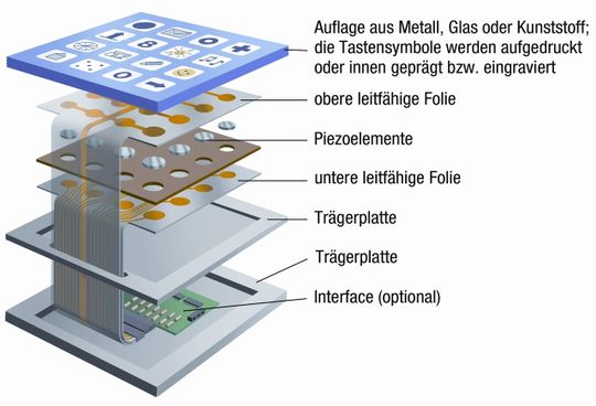 Die Auflagefolie, die der Anwender bei diesem Schaltertyp sieht, bedruckt oder prägt man mit den erforderlichen Informationen. Zwischen zwei Lagen leitfähiger Folie wird eine gelochte Isolierschicht, in der sich eine piezoelektrische Zelle befindet, eingebracht. Eine Aufspannplatte trägt die Anordnung (Bild 1).