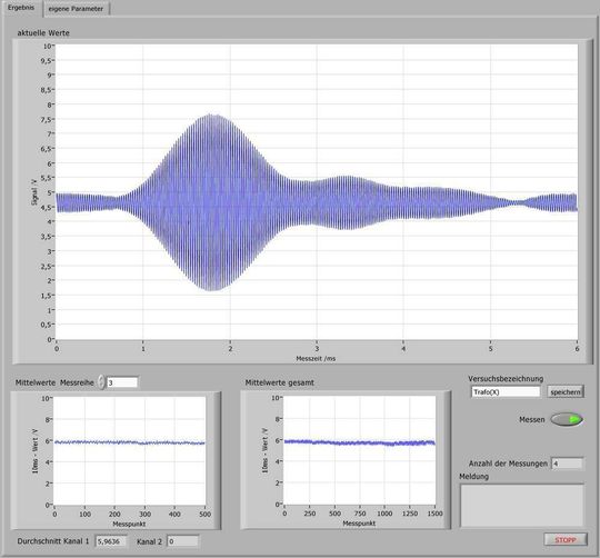 Das als Mealy-Automat gestaltete LabVIEW-Programm verarbeitet die Messwerte und stellt sie dar. Anschließend werden die Ergebnisse gespeichert. Dargestellt werden das Empfangssignal, sowie die ermittelte Differenzspannung des sinusähnlichen Empfangssignals. Zur Datenauswertung gehört des weiteren eine FFT-Analyse des Signals.