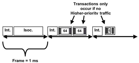 Da die minimale Zeit zwischen Transfers ein Frame oder mehr beträgt, müsste jede Transaktion innerhalb dieses Zeitrahmens für eine unterschiedliche Endpunktadresse sein. In Wirklichkeit ist ein Host nicht in der Lage, 19 Full-Speed-Interrupt-Transaktionen in einem einzigen Frame zu verarbeiten. Die maximale Anzahl von Interrupt-Transaktionen in der Praxis fällt somit geringer aus. Periodische Transfers können zusammen nicht mehr als 90% der verfügbaren Bandbreite einnehmen.