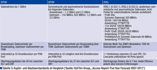 Während die Installationskosten erheblich von FTTH über FTTB bis zu FTTN/FTTR/FTTC variieren, bieten alle Konzepte unter den richtigen Bedingungen eine weitgehend vergleichbare Übertragungsleistung. Tabelle 3 stellt die drei gängigsten Standards vor, die im Rahmen aktueller Glasfaserinstallationen zum Einsatz kommen.