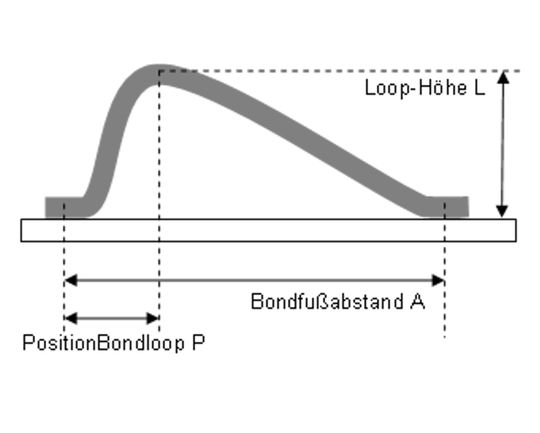 Dabei sind vor allem die drei eingezeichneten Parameter Loophöhe, Bondfußabstand und Position-Bondloop interessant. In der erwähnten Veröffentlichung von Ramminger konnte gezeigt werden, dass vor allem das Verhältnis von Loophöhe zu Loopweite unter rein mechanischer Belastung den größten Einfluss auf die Zuverlässigkeit hat. Da der Bondfußabstand bei den von uns verwendeten Testmodulen nicht variiert werden konnte, wurde lediglich die Loophöhe verändert und deren Auswirkung auf die Zuverlässigkeit in Power-Cycling-Tests untersucht. Der Faktor „Position-Bondloop“ wurde nicht explizit betrachtet bzw. gezielt variiert. Er ergibt sich aus den gewählten Loop-Parametern und der Loophöhe.