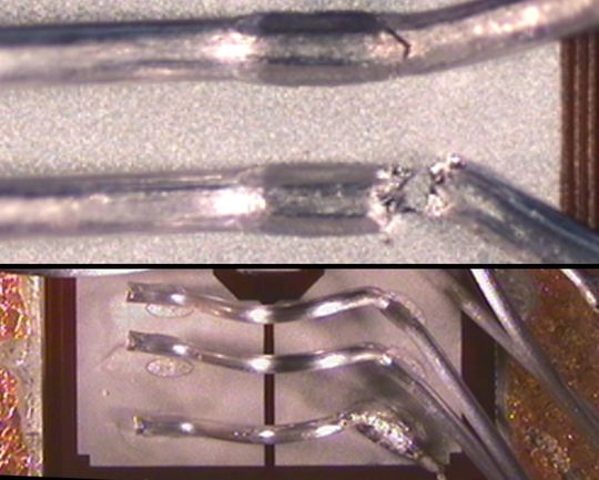 Nach Durchführung der Power-Cycling-Tests hat sich gezeigt, dass der Einsatz hoher Bondloops zu einer deutlichen Steigerung der Zyklenzahl führt. Eine Erhöhung der Loops von etwa 1,3 mm auf 3 mm führte zu einer Steigerung der zu erwartenden Lebensdauer von rund 70.000 auf 650.000 Lastwechsel-Zyklen. Dabei ergibt sich diese Steigerung hauptsächlich aus der Tatsache, dass sich das Fehlerbild von relativ früh auftretenden Fersenbrüchen hin zu wesentlich später auftretenden Bondabhebern verlagert. Die erhöhte Loop-Geometrie hat tatsächlich auch unter thermomechanischer Belastung eine stark positive Auswirkung auf die Zuverlässigkeit von Leistungsmodulen.