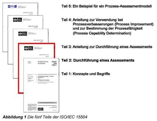 Zurzeit besteht die ISO/IEC 15504 aus fünf verabschiedeten Teilen (Bild 1). Der einzig normative Anteil ist der Teil 2; der die Durchführung von Assessments behandelt und standardisiert. Alle anderen Teile sind nur informativer Natur. Derzeit wird in Arbeitsgruppen der ISO an drei weiteren Teilen gearbeitet. Der Teil 6 wird zukünftig ein Beispiel für ein Prozess-Assessmentmodell beinhalten, das für die Domäne Systems Engineering geeignet ist. Der Teil 7 wird das Konzept des Reifegrades auf Organisationsebene einführen (bisher gibt es das nur auf Prozessebene). Und der Teil 8 schließlich wird das passende Prozess-Assessmentmodell zur ISO 20000 sein. Die ISO 20000 behandelt das Thema IT Service Management.