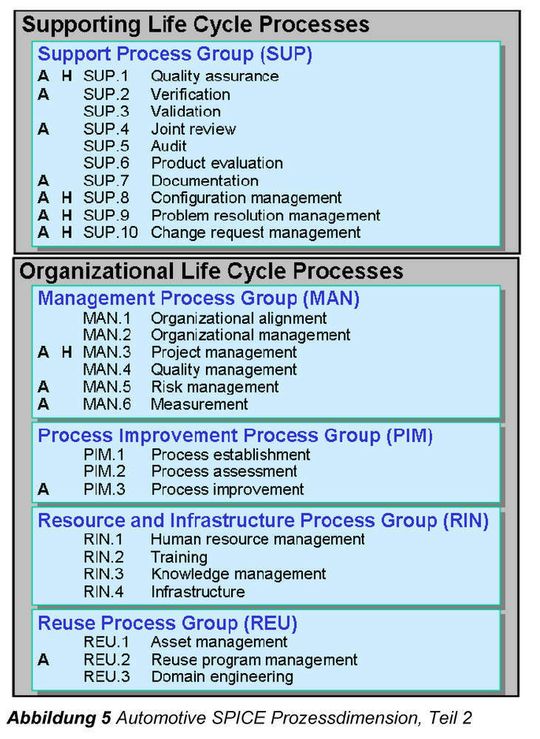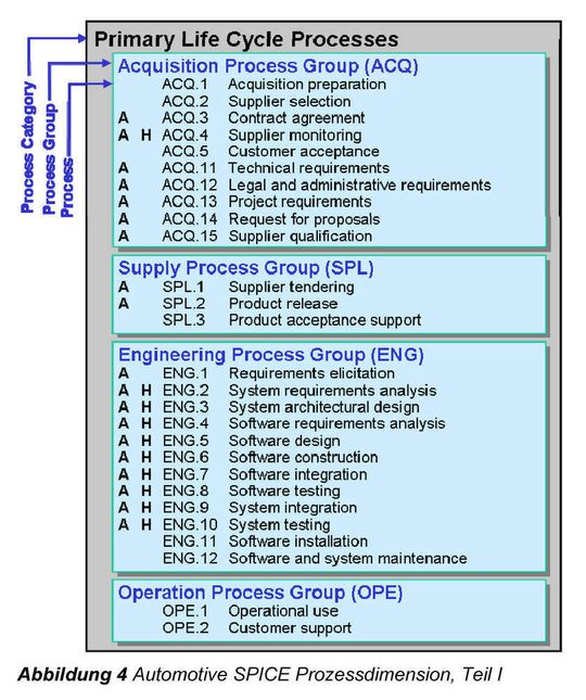 In den Bildern 4 und 5 sind die Prozesse der ISO/IEC 12207 dargestellt. Die 31 Prozesse aus Automotive SPICE sind dabei durch ein „A“ gekennzeichnet, wobei die Prozesse ACQ.11 bis ACQ.15 nicht zur ISO/IEC 12207 gehören, sondern speziell für Automotive SPICE definiert wurden.